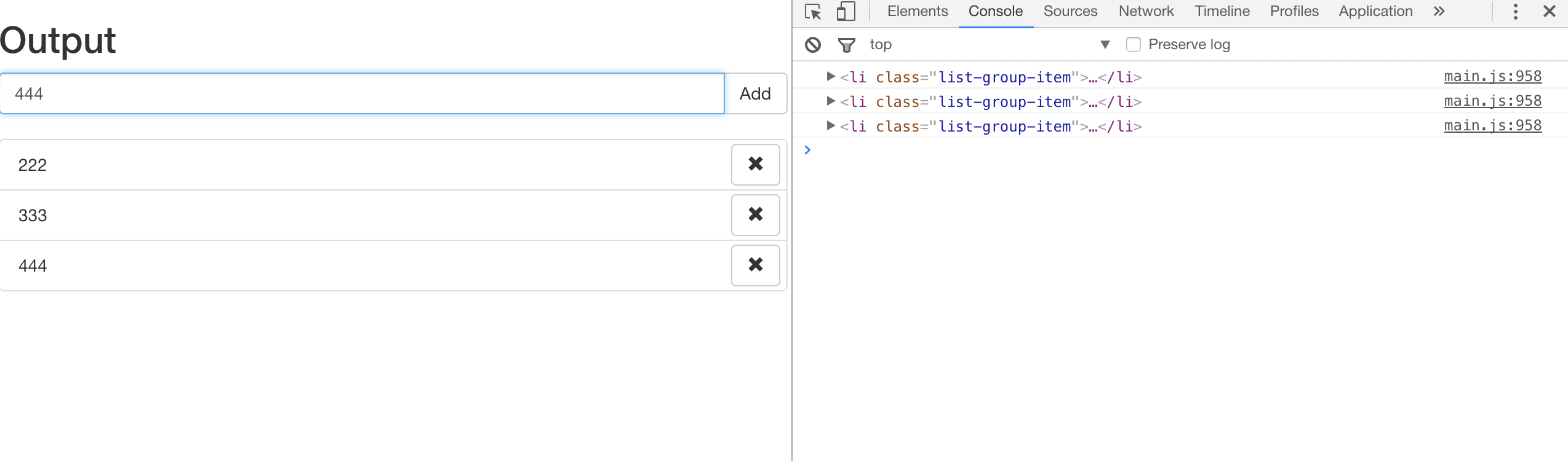 想象一下,首先 toggle$ Observable 被订阅,随后 remove$ Observable 被订阅。此时由于这两个 Observable 被订阅导致 $item Observable 被订阅了两次,所以对 input 与 add button 的 addEventlistener 逻辑执行了两次。在按下回车或者点击 add button 的时候,第一个 item$ Observable 的订阅逻辑先执行,向 DOM 中加入了一个 todoItem 并将 input 清空,此时再执行第二个 item$ Observable 的订阅逻辑,此时 input 里面已经为空,所以这个 item$ Observable 里面没有数据流过,这也是我们的代码没有按照预期执行的原因。为了验证这个猜想,我们只需要把 $item Observable 中的 do 操作符中的 $input.value = '' 注释掉就可以更直观的观察到程序现在的运行状态了: