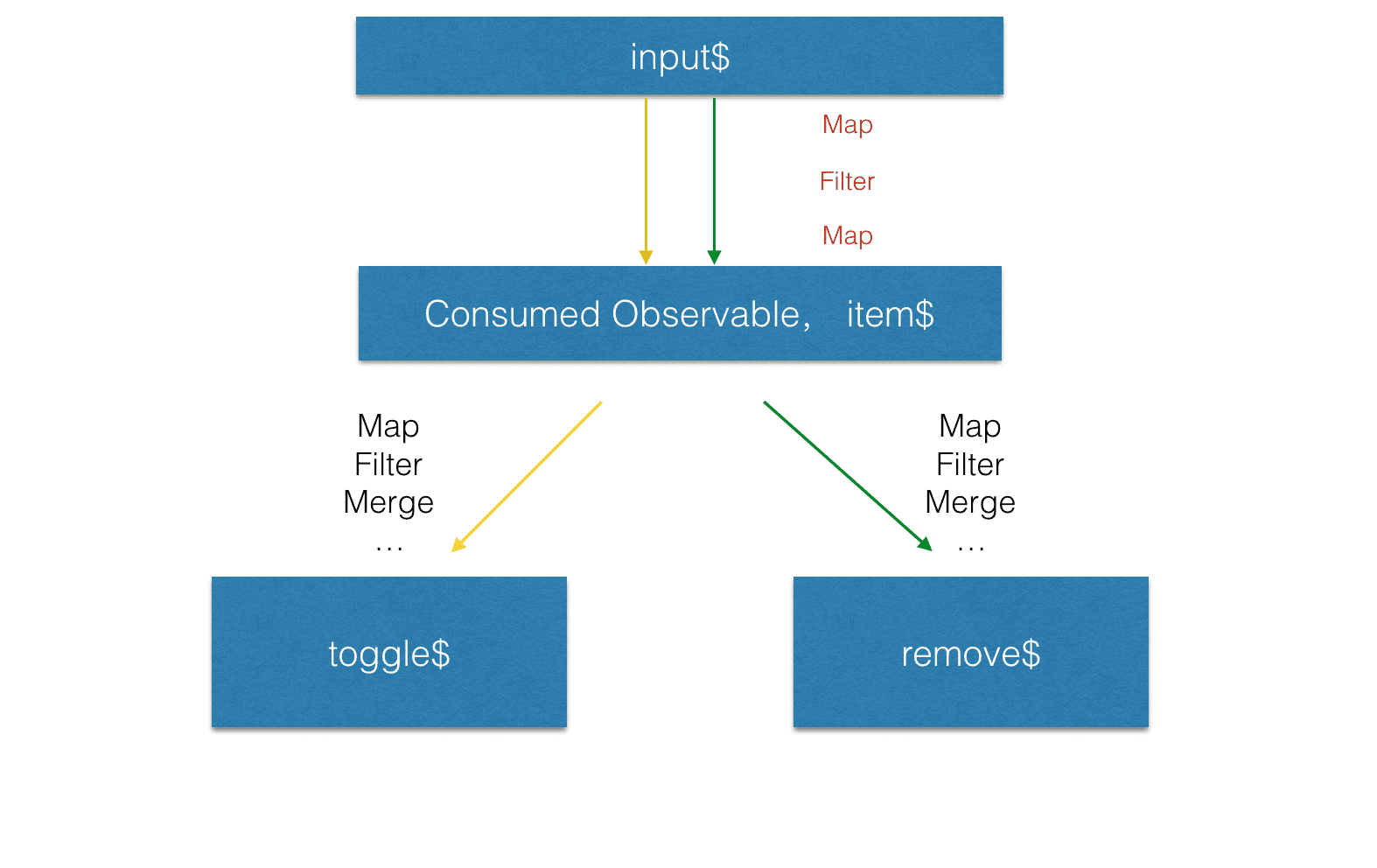 在上图中,toogle$ Observable 先订阅并执行了黄色箭头部分的过程,remove$ Observable 订阅的时候重新执行绿色部分的过程,然而这个时候流里面 input$ 已经不会流数据出来了。