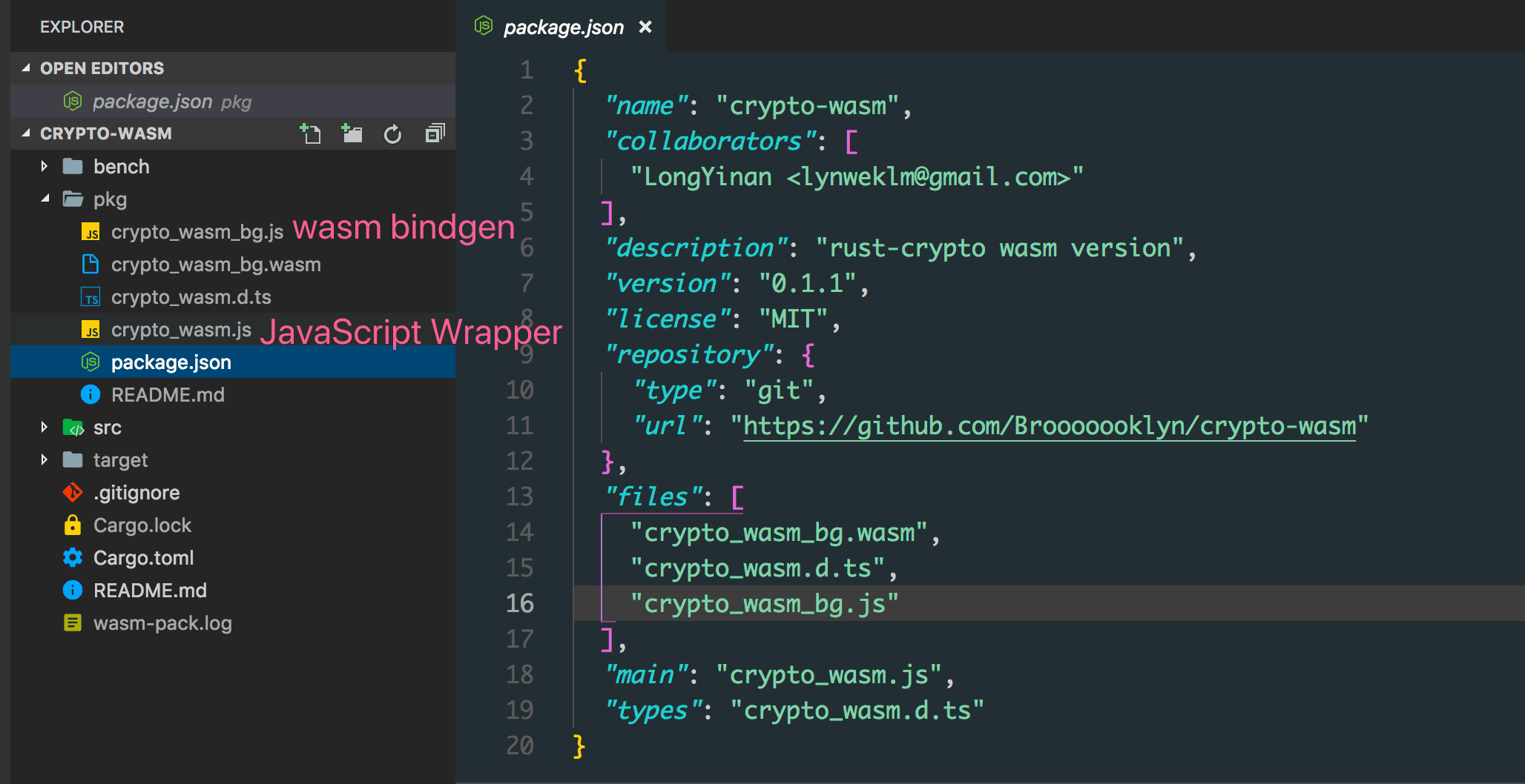 这是 wasm-pack 生成出来的文件,pkg 目录是 wasm-pack 自动生成的文件,里面的内容发布为 npm package 之后,使用方可以直接